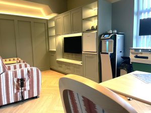 The open space can accommodates three or four family groups where they can meet to have some ‘me’, or ‘us’, time, help themselves to tea and coffee, pick up a magazine or even watch the 55” TV screen.