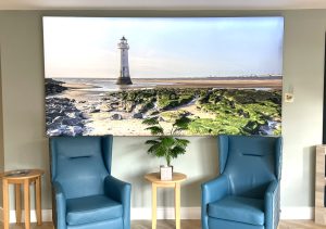 A wall size, backlit photo-mural of the New Brighton lighthouse sets the room off spectacularly. It’s both a talking point and something that people might gaze at to become lost in thought or in evocative memories.