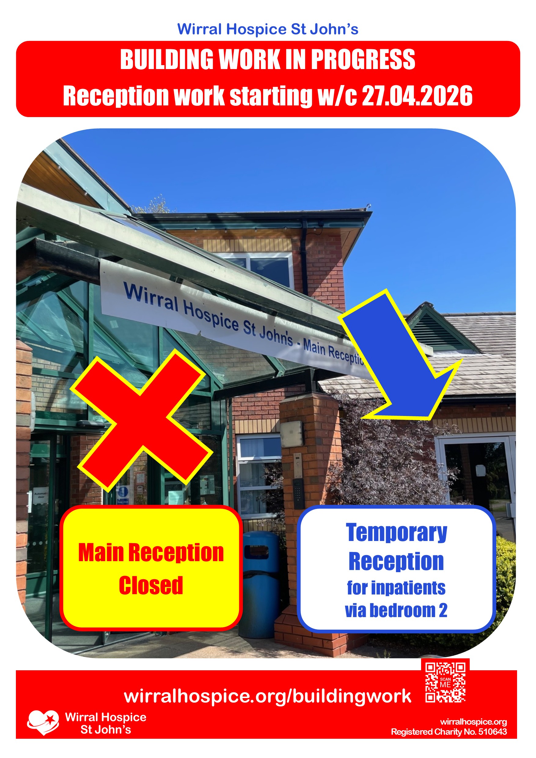 From Monday 27 April, our main reception will be closed – with a temporary reception set up to access our inpatient ward via bedroom 2.